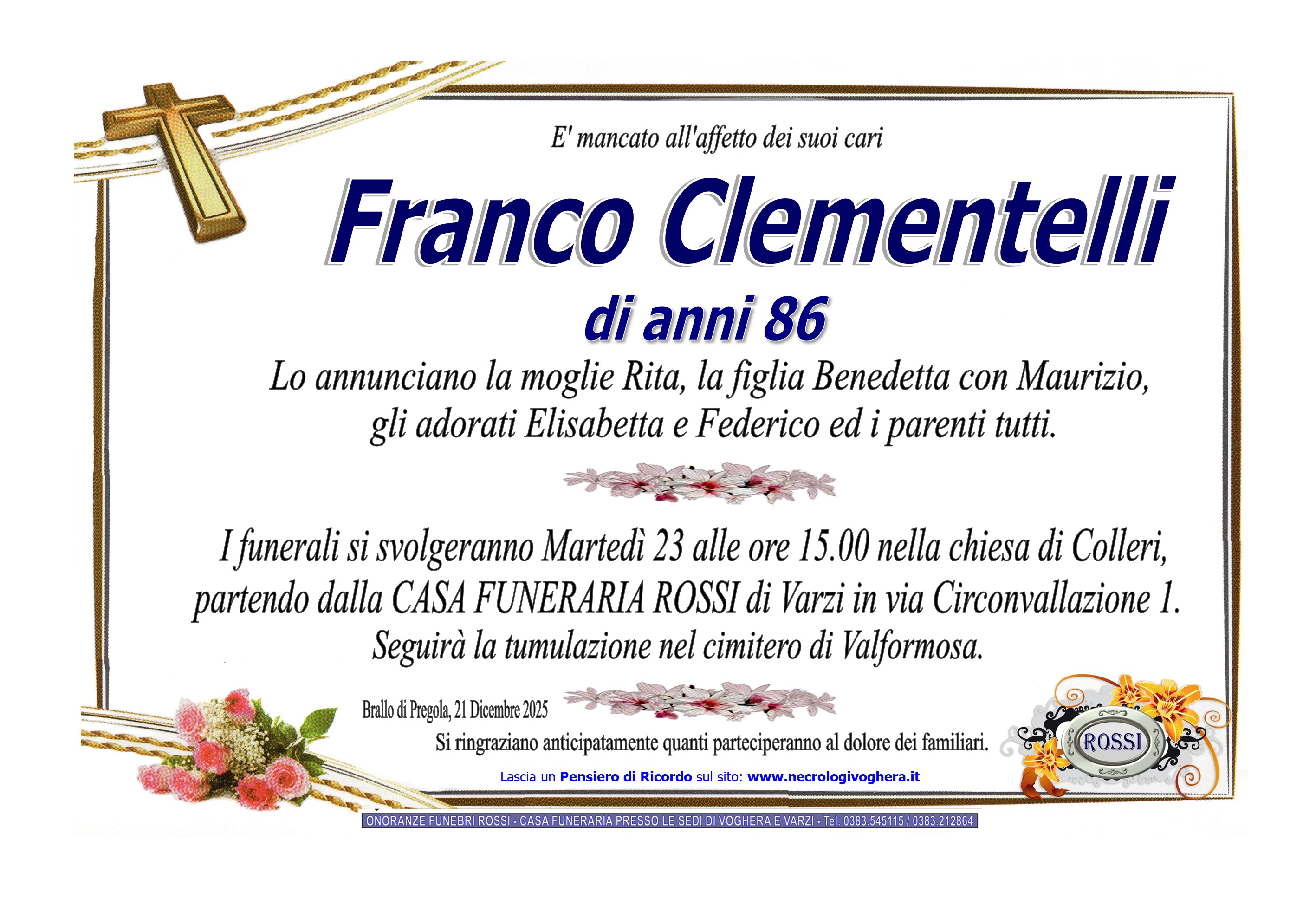 I familiari ringraziano anticipatamente tutti coloro che parteciperanno alla cerimonia funebre