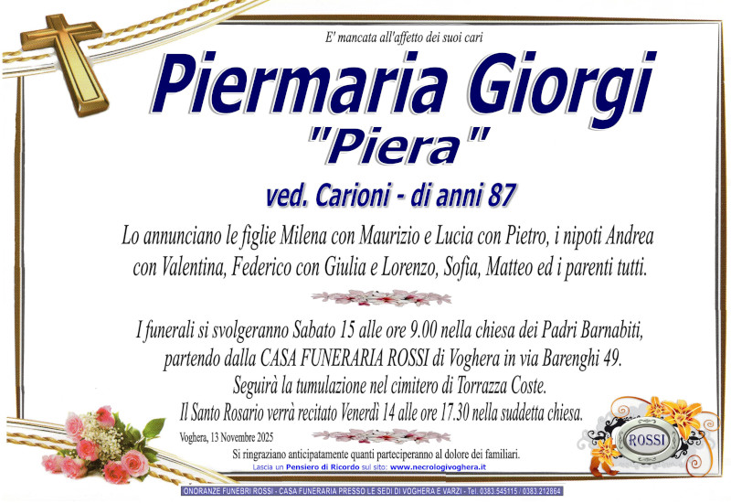 Alla Famiglia Carioni Le nostre condiglianze per la perdita Della loro cara. Cara Piera Ti siamo vicine con la Preghiera Sei stata amorevole e Un esempio per tutti quanti hanno avuto la fortuna di conoscerti.